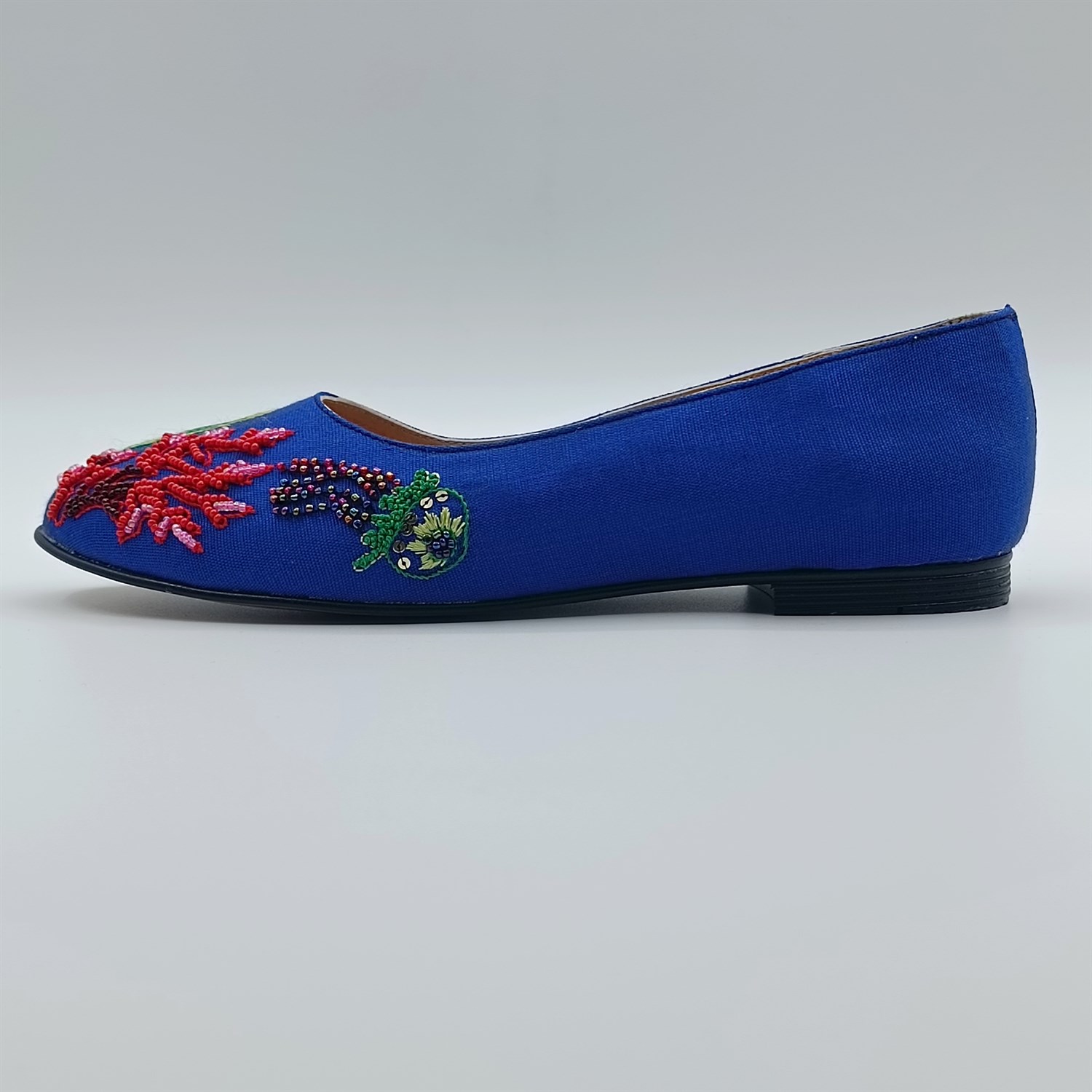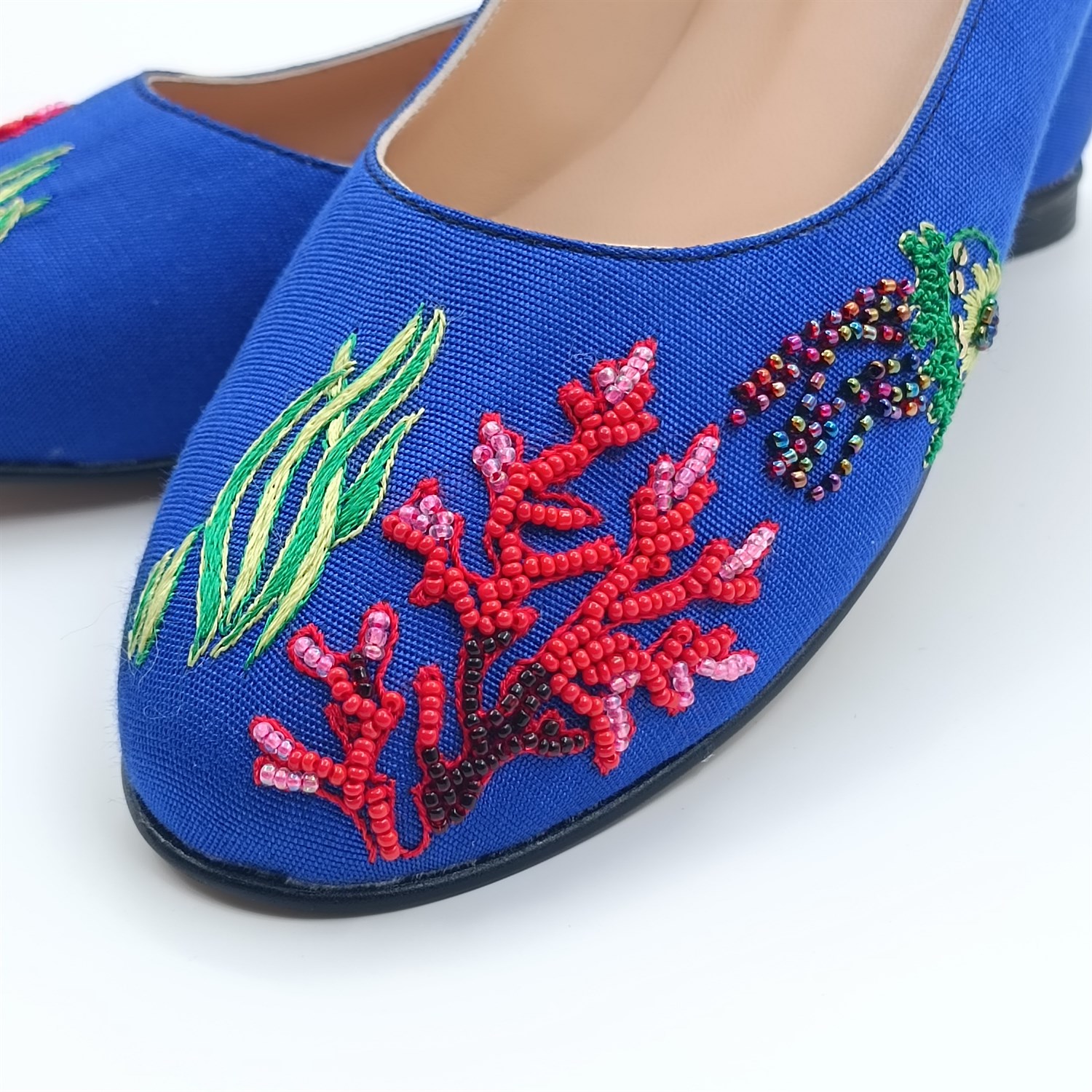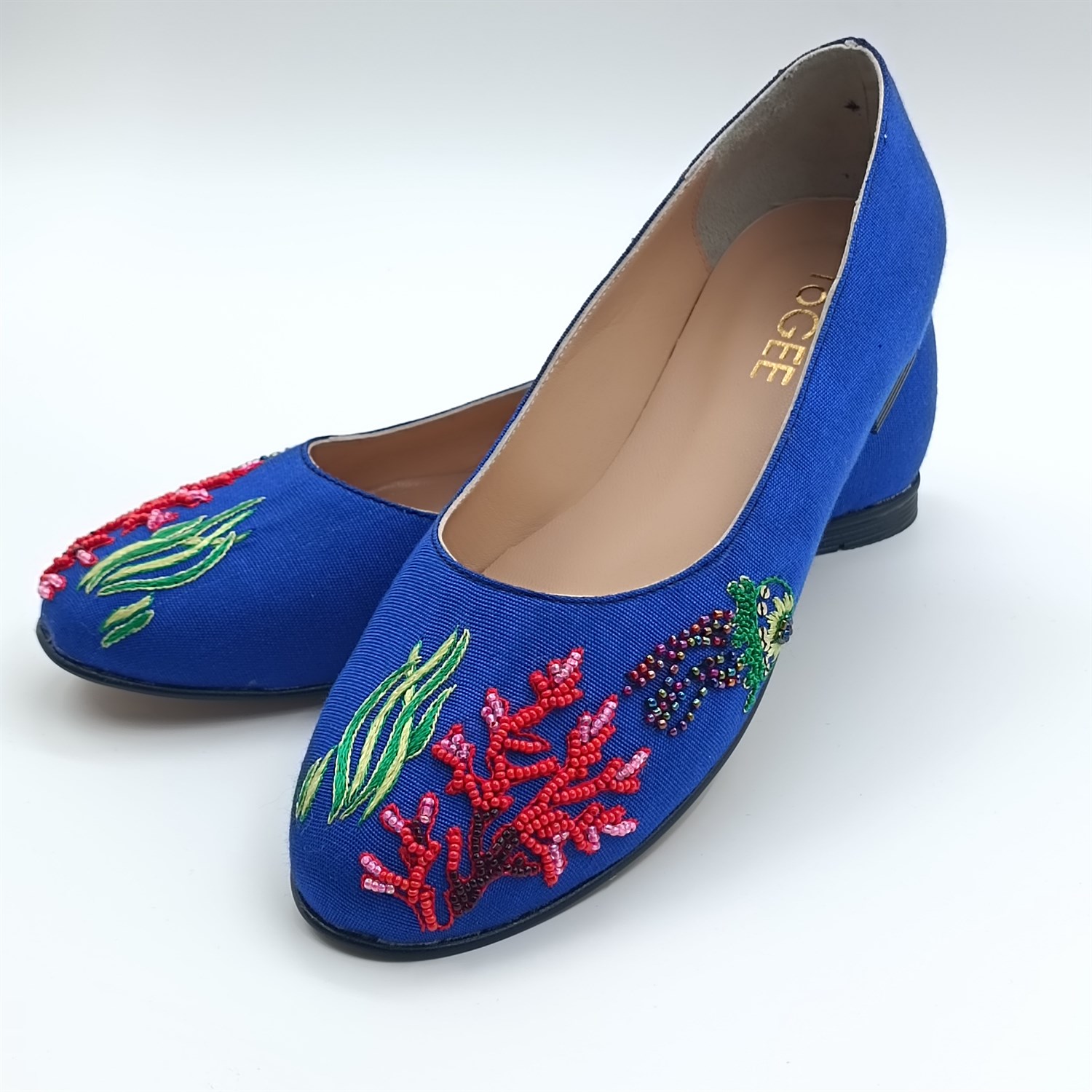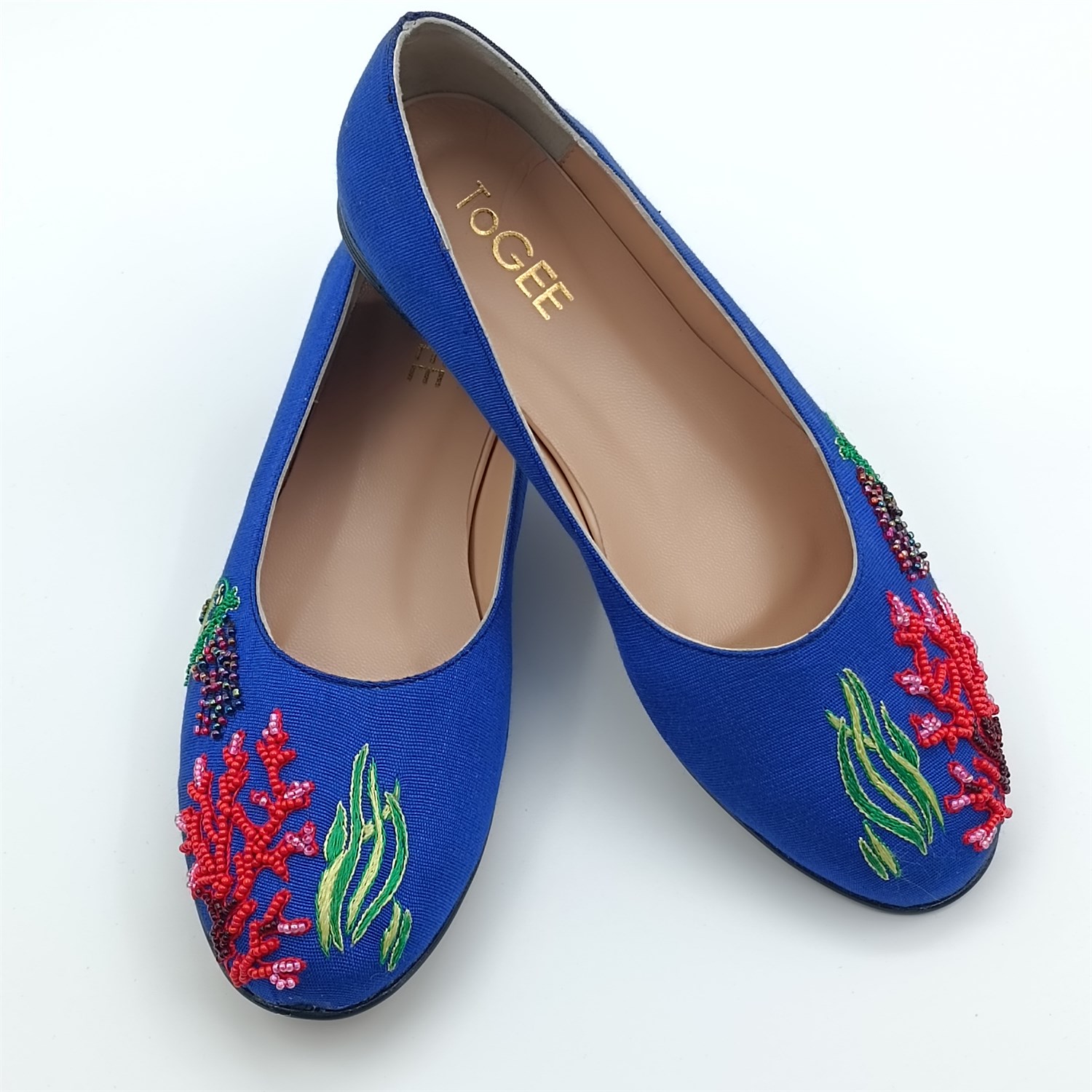 Canlı mavi tonları ve zarif el işçiliğiyle işlenen mercan ve deniz bitkisi motifleriyle bu özel ToGEE balerin ayakkabılar, tarzınıza özgün bir dokunuş katıyor. Yumuşak iç tabanı ve şık tasarımı sayesinde hem günlük kullanıma hem de özel anlara eşlik edecek. Renkli ve enerjik ruhunuzu yansıtan bu model, her adımda kendinizi daha özgür hissettiriyor.