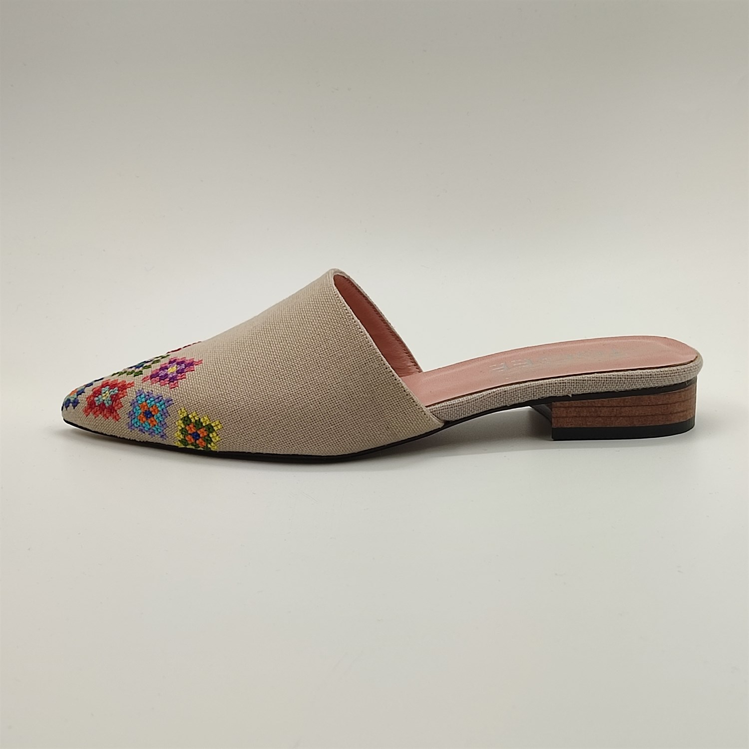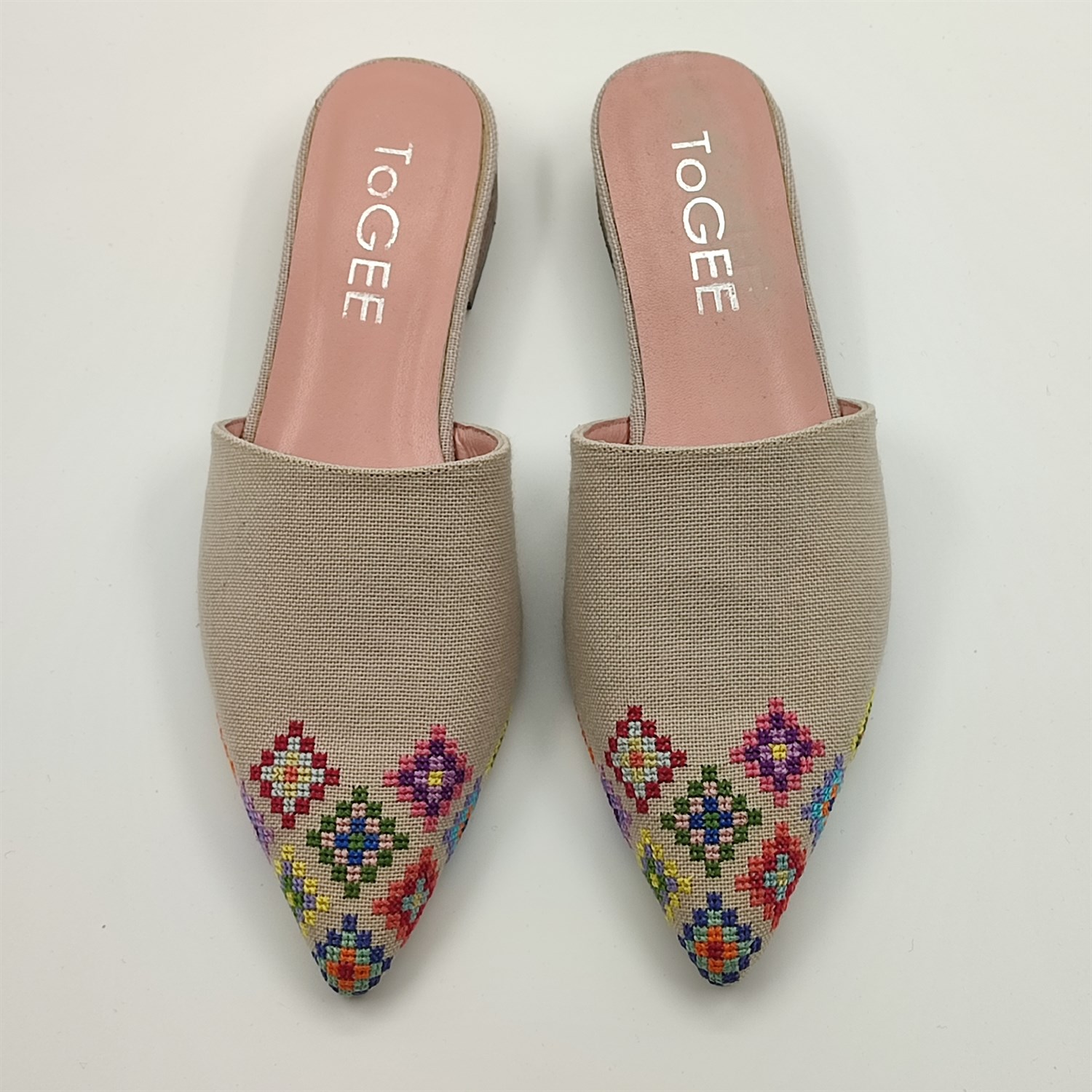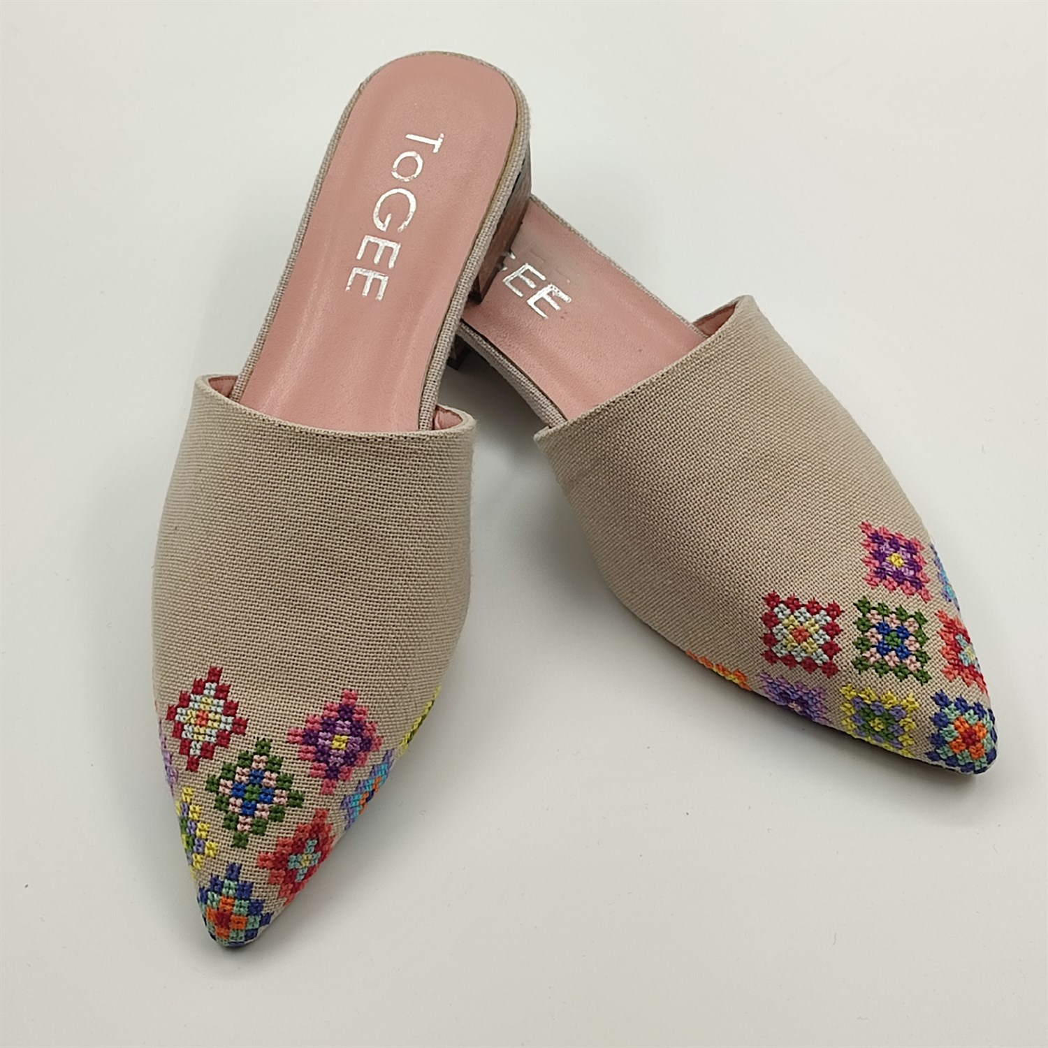 Kanaviçe işlemeli terlik. Karmaşık iplik renkleri ile geleneksel kanaviçe tekniği kullanılarak keten kumaş üzerine işlenmiştir. Günlük kullanımlarınıza renk katmak için son derece uygun bir seçimdir.