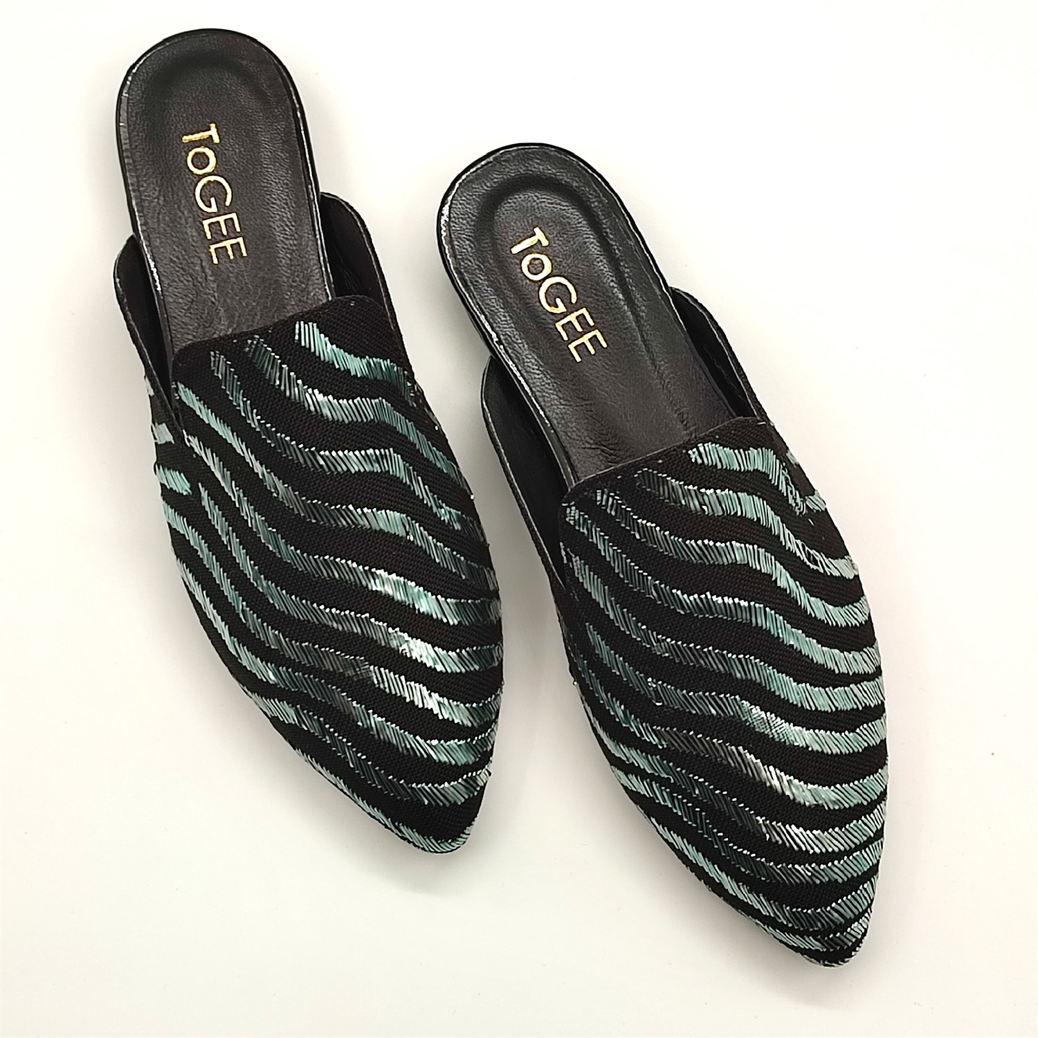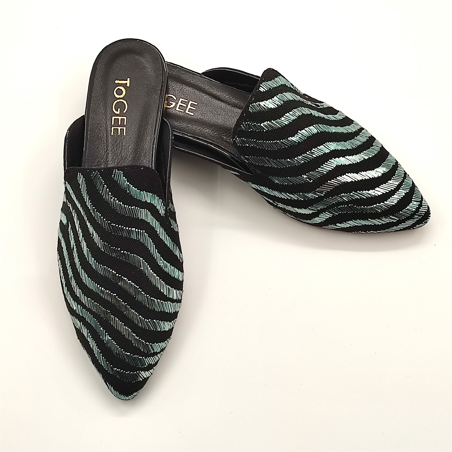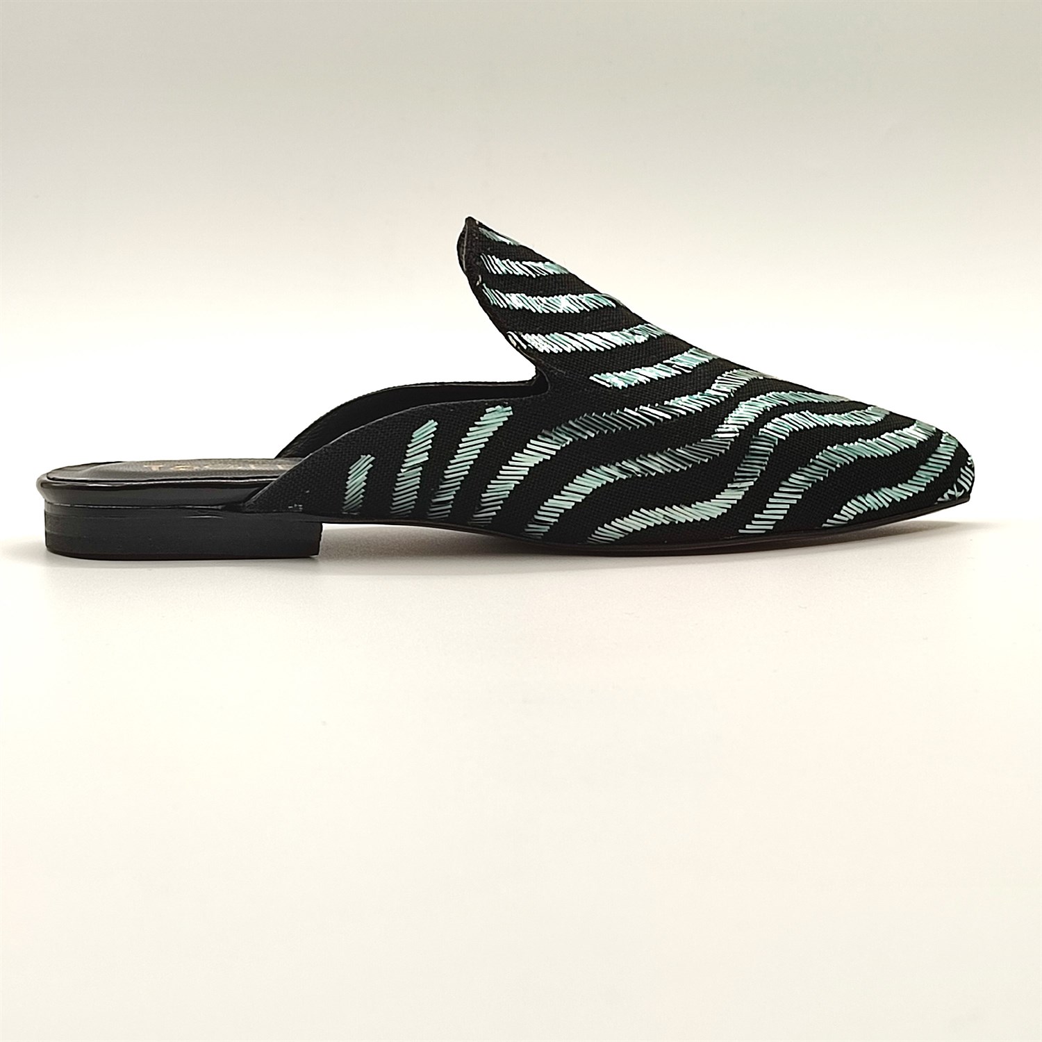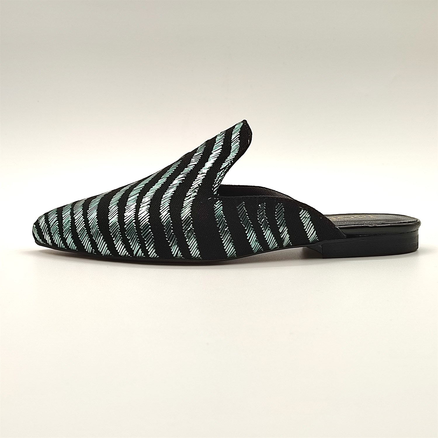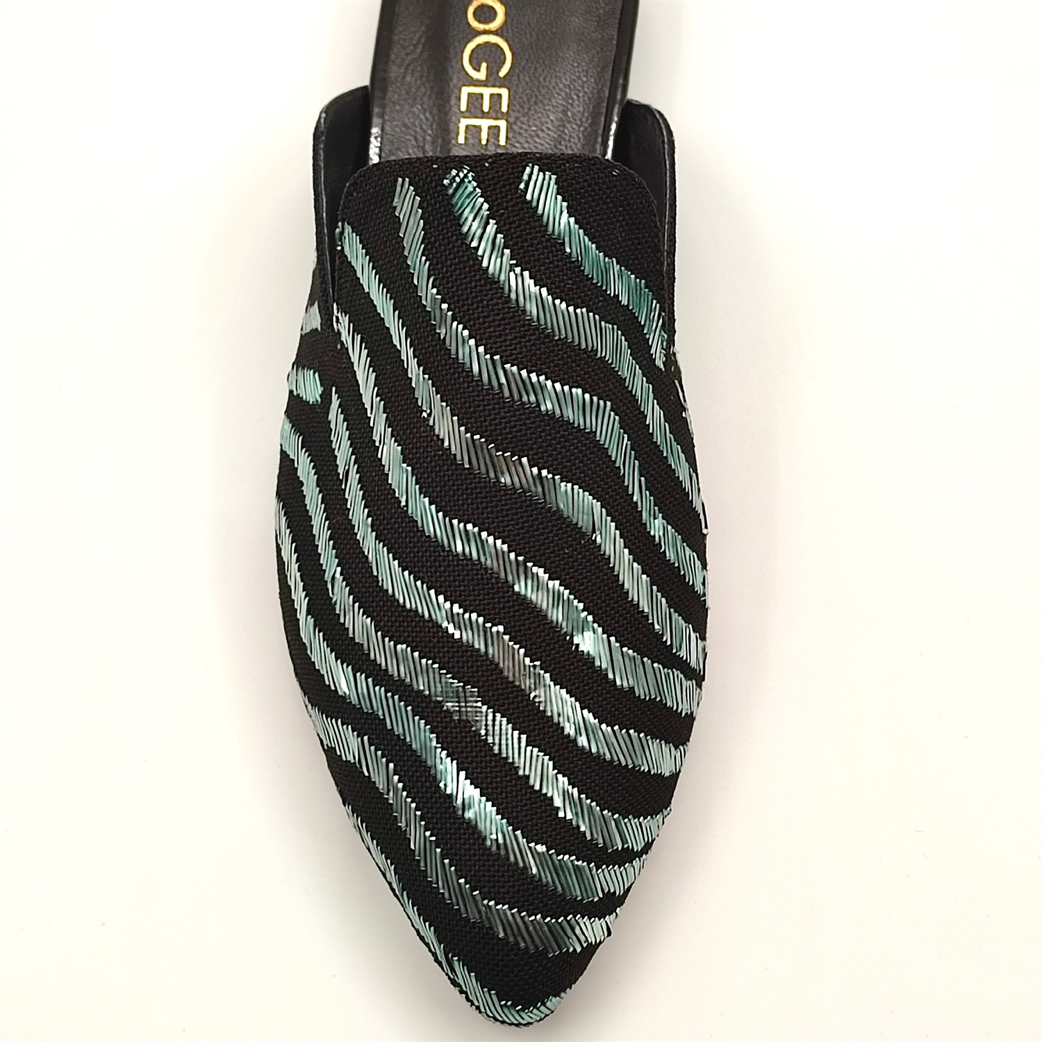 Siyah zemin üzerinde yeşil parlak tellerle ilmek ilmek işlenen göz alıcı bir görünüşe sahip muhteşem bir ışıltı.