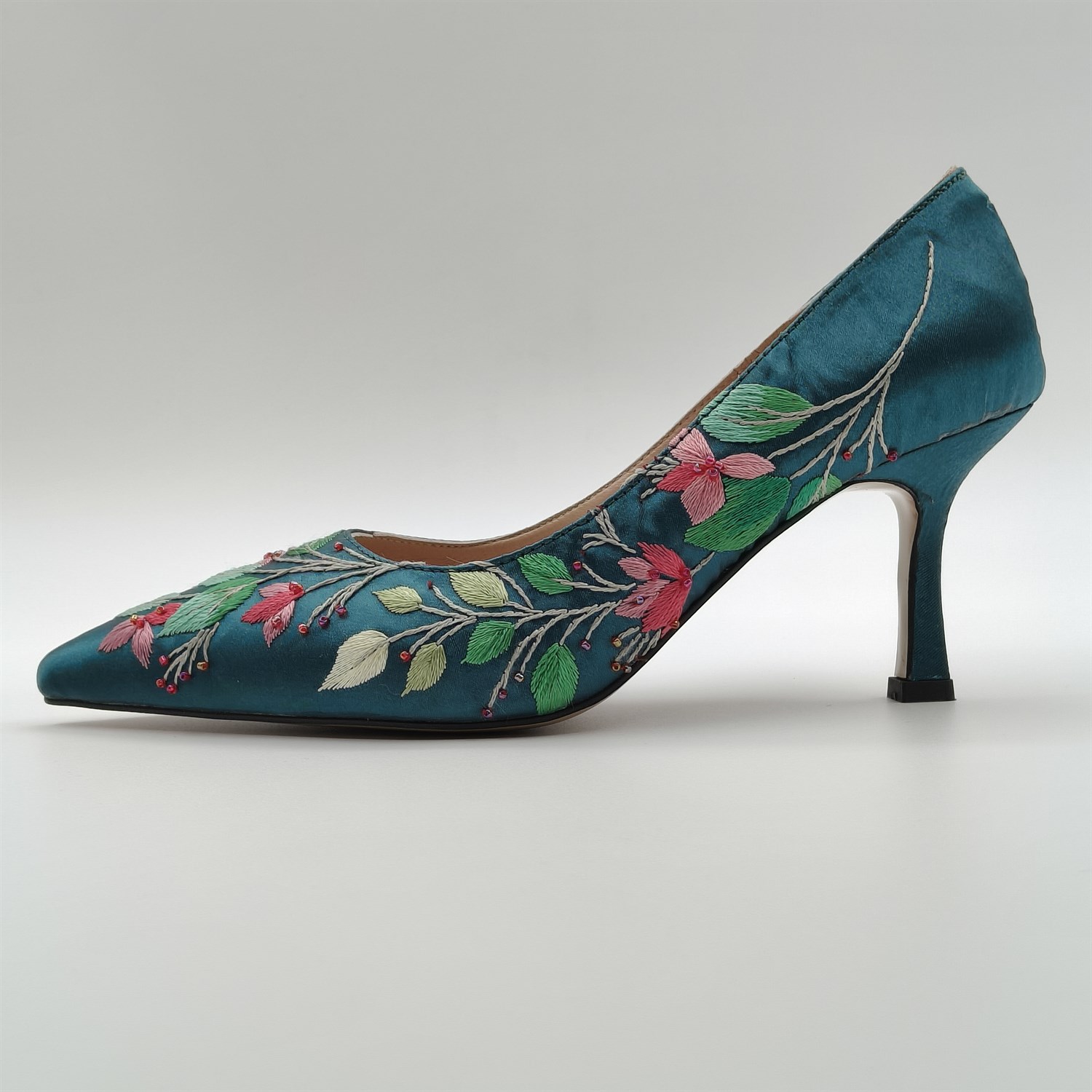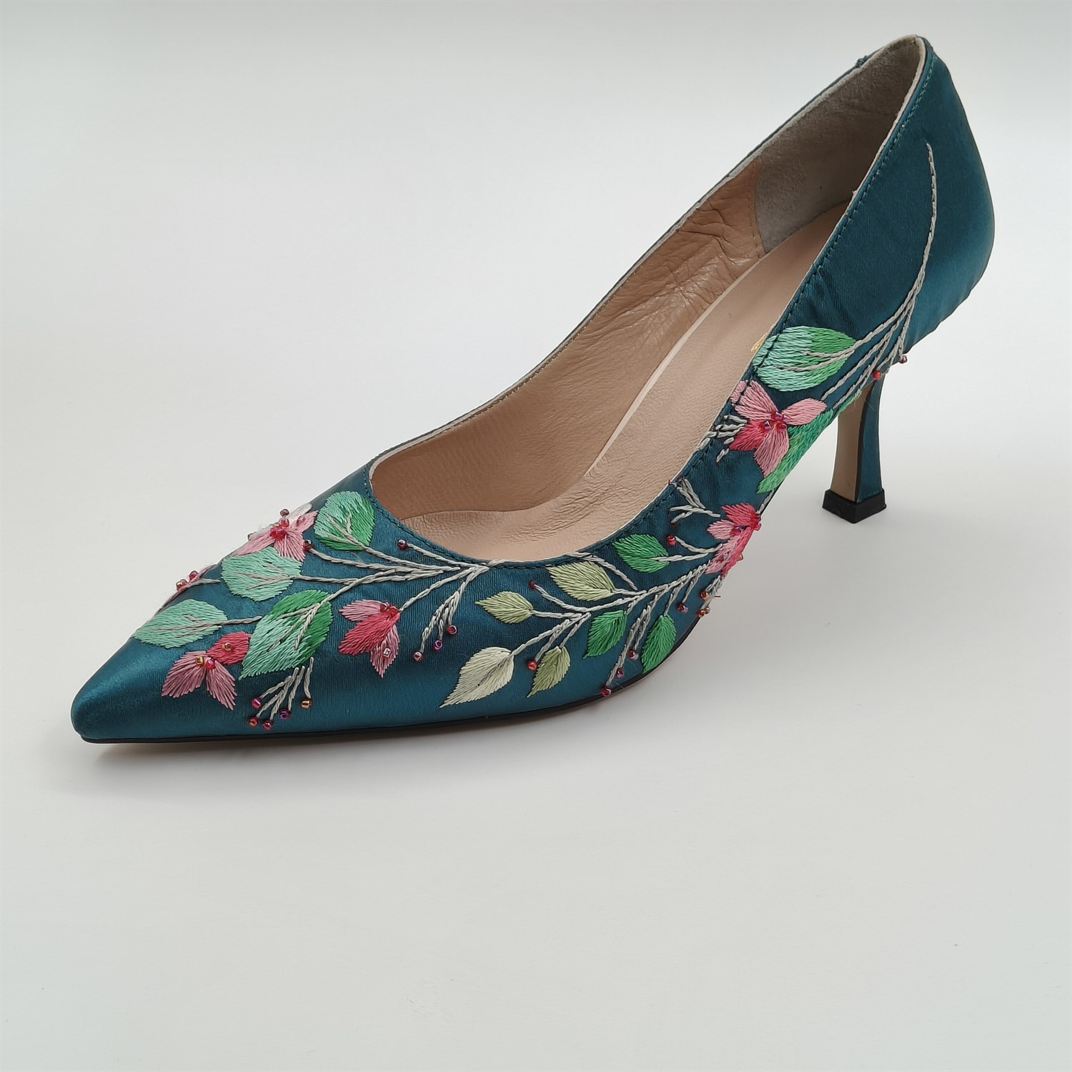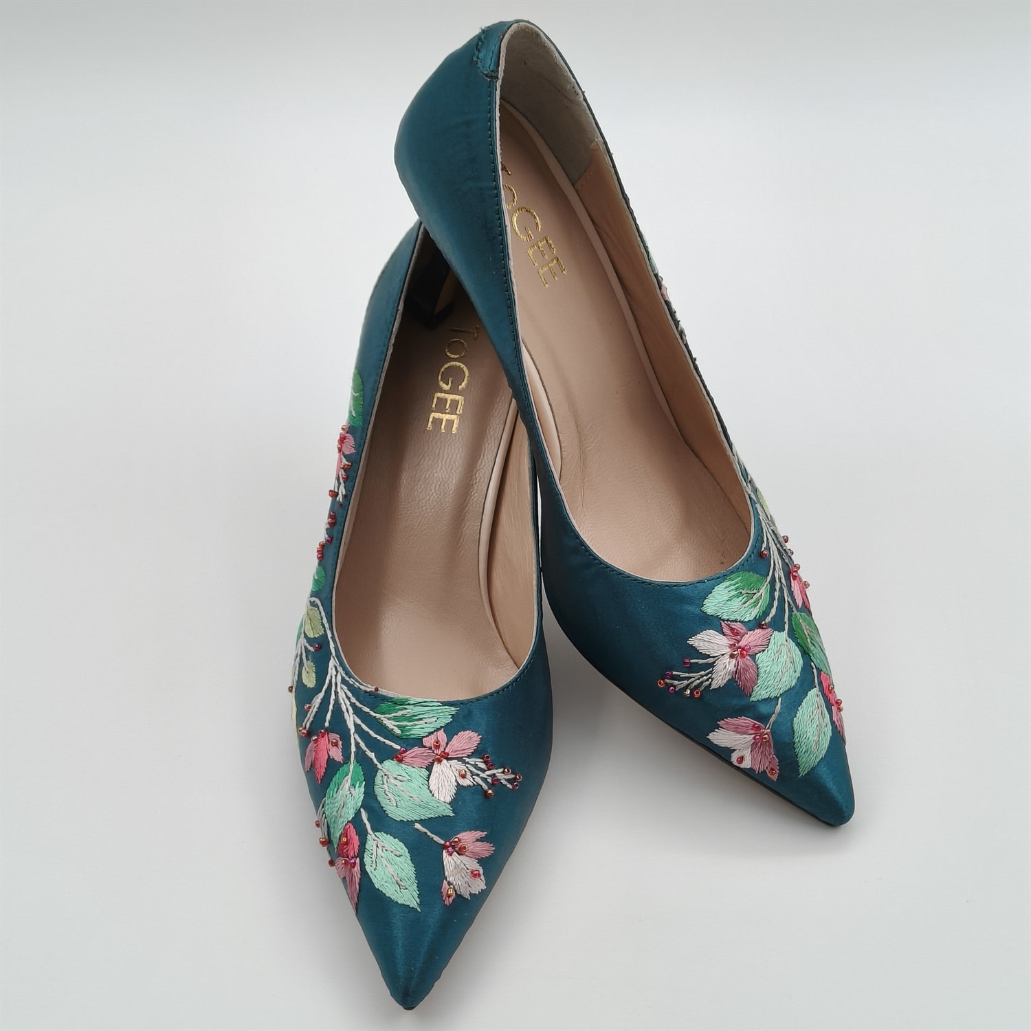 Petrol mavisinin derinliğinde açan el işçiliği çiçekler, ToGEE stilettolarla adımlarınıza romantik bir hikâye katıyor. Zarif yapraklar ve nazlı çiçekler, her bakışta bir bahar rüyasını fısıldıyor. Aşkı ve zarafeti bir arada hissetmek isteyenler için tasarlandı.